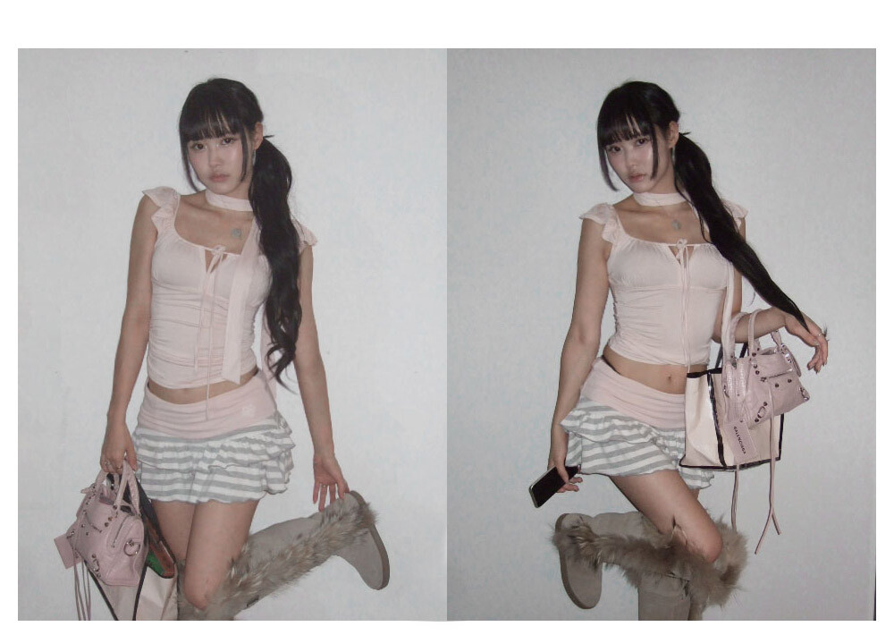 -가슴부분 트임 디테일과 셔링이 돋보이는 탑 -어깨부분 프릴 , 소프트 핑크 컬러와 가슴밑 부분 토션레이스가 러블리한 무드를 연출해줌 -허리셔링으로 몸매 보정 효과 -짧지 않은 기장으로 편하게 착용가능 -모달,스판 혼용원단으로 굉장히 촉감이 좋고 신축성이 좋아 착용감이 뛰어남 -같은 원단 스카프 세트로 완성도 있는 룩 완성 -어깨밴딩, 가슴부분 셔링 취향껏 조절 가능 -언더웨어 보이지 않는 위치까지 트임 -핑크 컬러 특성 상 비침이 있을 수 있음 (누드톤 보다는 같은 톤의 언더웨어 매치 추천)