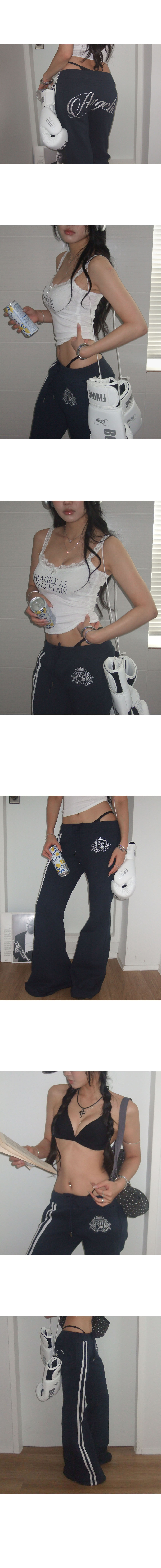 -라인과 힙부분의 자수, 엠블럼이 포인트되는 팬츠